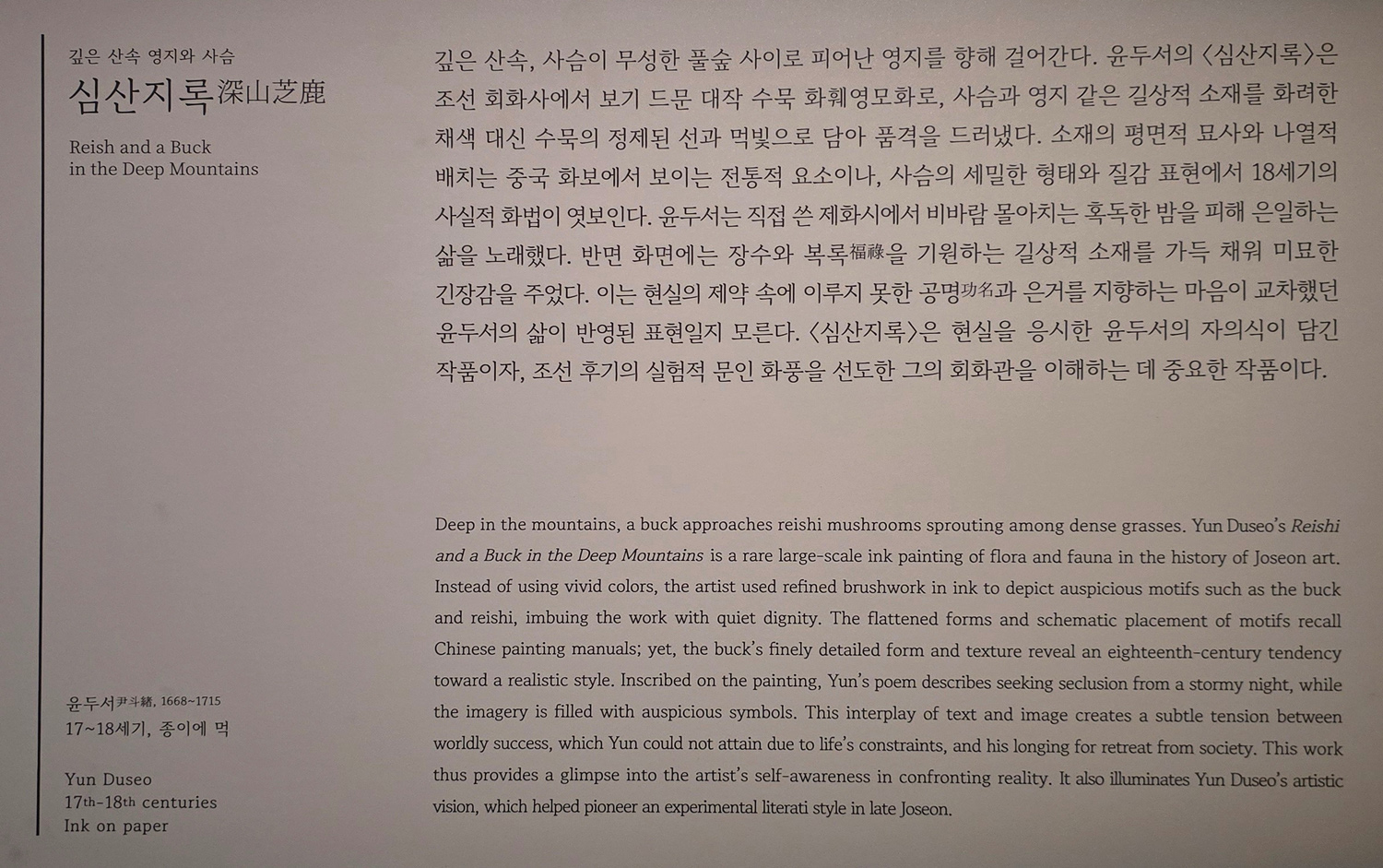 사슴과 영지 같은 길상적 소재를 화려한 채색 대신 수묵의 정제된 선과 먹빛으로 담아 품격을 드러냈다.
