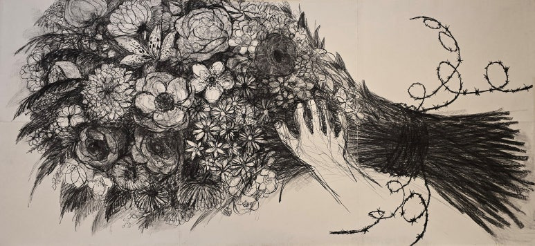 [Offering Flowers / 2025 / Charcoal on Korean paper / 300x642cm / 헌화 / 일부분]