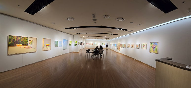 [출입구에서 파노라마로 담은 전시실 내부 전시 작품 전경]