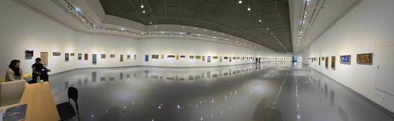 [출입구에서 파노라마로 담은 전시실 내부 전시 작품 전경]